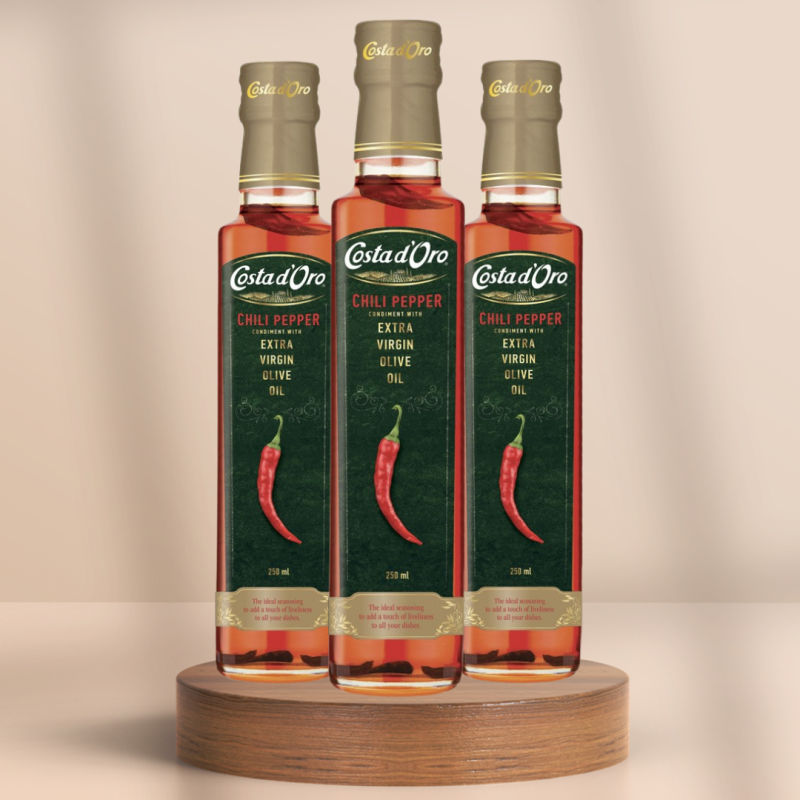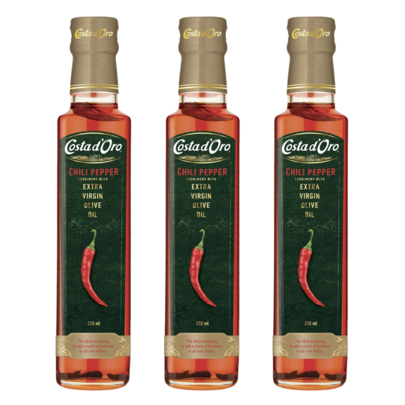 Suchen Sie nach einer pikanten Ergänzung für Ihre Gerichte? Das **Chili Olivenöl Vorteilspaket** enthält drei Flaschen à 250ml mit hochwertigem, nativem Olivenöl extra, verfeinert mit aromatischer Chili-Schärfe. Ideal für alle, die ihre Speisen mit einer feurigen Note abrunden möchten.