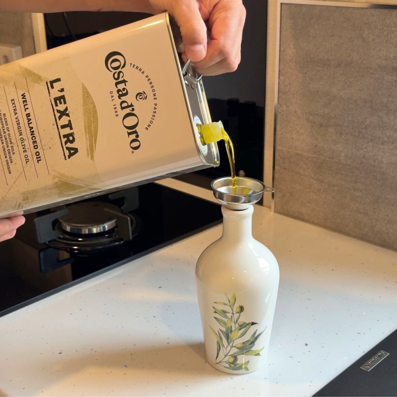 Gebruik de 3 liter extra vierge olijfolie voor dagelijks koken, bakken en dressings. Voeg met de truffelolie een verfijnde touch toe aan pasta’s en risotto’s, of geef je pizza en gegrilde groenten extra karakter met chili-olie. Dankzij het schenktuitje en de mini-trechter werk je altijd schoon en gecontroleerd.