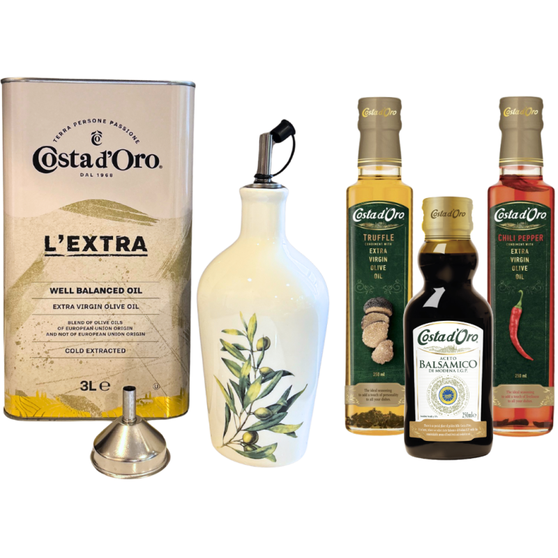 Deze uitgebreide bundel biedt niet alleen een royale voorraad hoogwaardige extra vierge olijfolie, maar ook twee exclusieve smaakvarianten: truffel voor luxe gerechten en chili voor een subtiele pittige kick. Samen met de elegante keramische fles creëer je een stijlvolle presentatie op tafel én optimaal gebruiksgemak in de keuken.