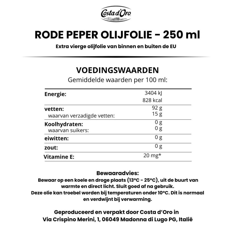 Breng uw gerechten tot leven met onze Rode Peper Extra Vierge Olijfolie. Perfect voor pizza, pasta, marinades en meer!