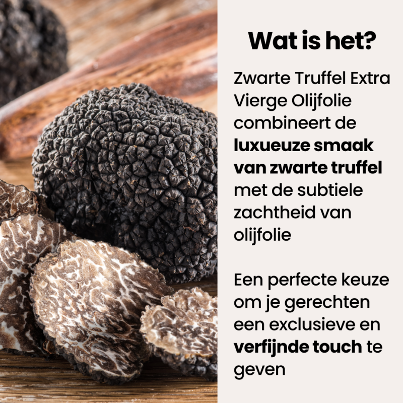 De combinatie van pure extra vierge olijfolie en de verfijnde aroma’s van truffel maakt deze olie tot een ware delicatesse. De diepe, aardse smaak van truffel geeft gerechten direct een luxueuze en gastronomische touch. Een scheutje van deze truffelolie transformeert elk gerecht in een culinaire belevenis.